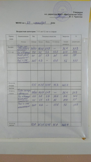 Сведения об организаторе питания: МБОУ "Мансуровская ООШ"